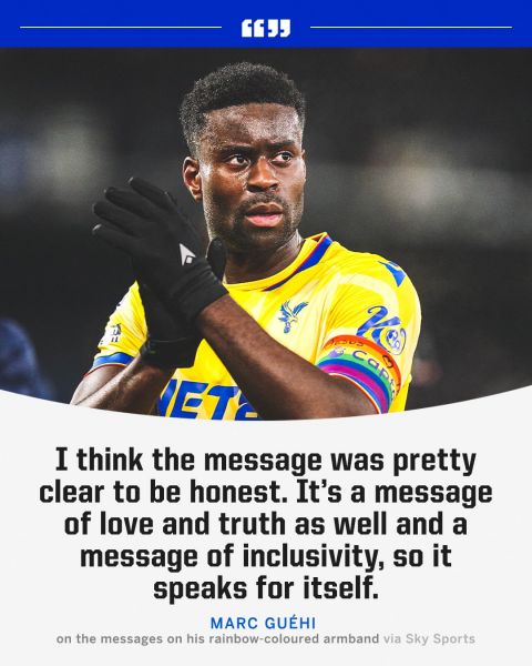 Ωστόσο, υπάρχουν και αυτοί που έχουν μία διαφορετική άποψη πάνω σε αυτό το θέμα. Εκείνοι που δεν ταυτίζονται απόλυτα με το εν λόγω θέμα. Ένας από εκείνους είναι και ο Μαρκ Γκουεΐ. Ο αρχηγός της Κρίσταλ Πάλας σε ένα από τα πιο πρόσφατα ματς της ομάδας του ναι μεν φόρεσε το πολύχρωμο περιβραχιόνιο. Αλλά πάνω του έγραψε το σύντομο μήνυμα: «Αγαπώ τον Ιησού».