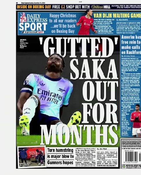 Οι σελίδες από τις αγγλικές εφημερίδες που παίζουν ως πρώτο θέμα τον τραυματισμό του Μπουκάγιο Σάκα: