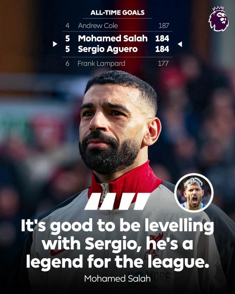 Με αυτά τα δύο τέρματα, ο Σαλάχ έφτασε τα 184 γκολ στην Premier League, ισοφαρίζοντας τον Σέρχιο Αγκουέρο στη λίστα των κορυφαίων σκόρερ όλων των εποχών. Πλέον, χρειάζεται μόλις ένα ακόμη γκολ για να ξεπεράσει τον Αργεντινό θρύλο της Μάντσεστερ Σίτι και να ανέβει ακόμη ψηλότερα στη σχετική κατάταξη.