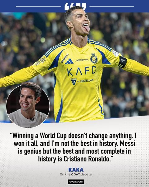 Η γνώμη του Κακά μετράει. Ο λόγος του έχει άλλη βαρύτητα. Λιτός και σοβαρός. Όπως και όταν είχε την μπάλα στα πόδια του. Σύμφωνα με τον ίδιο δεν υπάρχει κανένα debate για το ποιος είναι ο καλύτερος παίκτης τα τελευταία χρόνια. Ο Βραζιλιάνος κατέταξε τον Κριστιάνο Ρονάλντο πιο πάνω από τον Λιονέλ Μέσι και εξήγησε ότι το Παγκόσμιο Κύπελλο του Αργεντινού που κατέκτησε το 2022 δεν μπορεί να αλλάξει την καριέρα των δύο!