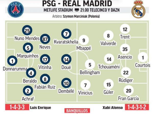 Τα ρεπορτάζ θέλουν τους δύο προπονητές να ρίχνουν στο χορτάρι όλα τα δυνατά τους όπλα. Αμφότεροι επικεντρώνονται στη γραμμή κρούσης. Εκεί όπου ο Κιλιάν Μπαπέ θα βρεθεί απέναντι στην παλιά του ομάδα. Οι Παριζιάνοι θα παραταχθούν με τους Κβαρατσχέλια, Ντουέ και Ντεμπελέ. Από την άλλη, οι Μαδριλένοι θα κατέβουν με τους Μπαπέ – Βινίσιους και Μπέλιγχαμ ακριβώς από πίσω τους.