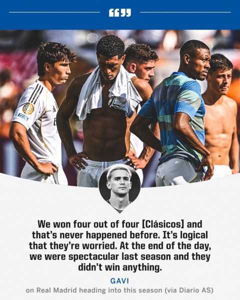 «Τους καταλαβαίνω πολύ καλά. Πέρυσι τους νικήσαμε σε τέσσερα “Κλάσικο”. Κάτι τέτοιο δεν έχει γίνει ποτέ ξανά. Μπορώ να καταλάβω, γιατί είναι τόσο προβληματισμένοι και αγχωμένοι. Την περασμένη σεζόν τα σαρώσαμε όλα. Ήμασταν φανταστικοί, αλλά η Ρεάλ Μαδρίτης δεν κατάφερε να σηκώνει τίποτα. Ήταν μία αποτυχημένη χρονιά για εκείνη και πλέον μας φοβούνται ολοένα και περισσότερο», τα λόγια του.