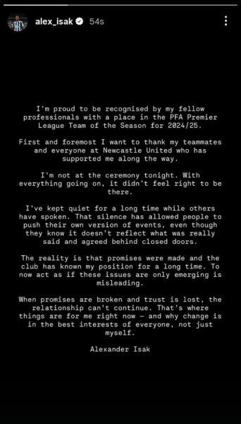 Αναλυτικά όλα όσα έγραψε στον προσωπικό του λογαριασμό ο Αλεξάντερ Ίσακ, μετά την ανάδειξή του στην 11αδα της σεζόν της Premier League:
