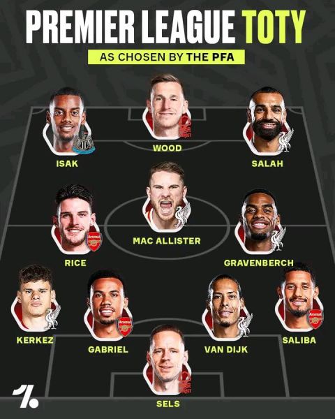 Τα τελευταία χρόνια η βράβευση για τον καλύτερο παίκτη και την καλύτερη 11αδα γίνεται με την αρχή της νέας σεζόν. Πάντα για την προηγούμενη. Έτσι, λοιπόν, στην 11αδα της Premier League -που ψηφίστηκε από τους ίδιους τους παίκτες- ξεχωρίζουν το δίχως άλλο η ισχυρή παρουσία της Λίβερπουλ, της Άρσεναλ, αλλά και της Νότιγχαμ Φόρεστ.