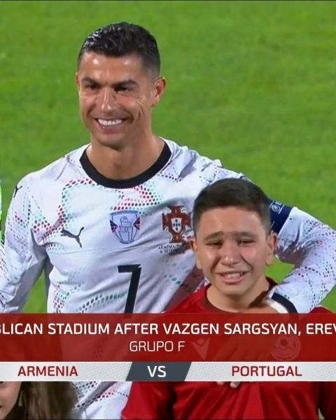 Η αντίδραση και η έκφραση στο πρόσωπο ενός νεαρού Αρμενία όπου συνόδευσε τον Κριστιάνο Ρονάλντο στον αγωνιστικό στο παιχνίδι της Αρμενίας με την Πορτογαλία για τα προκριματικά του Παγκοσμίου Κυπέλλου τ0υ 2026 τα λέει όλα!