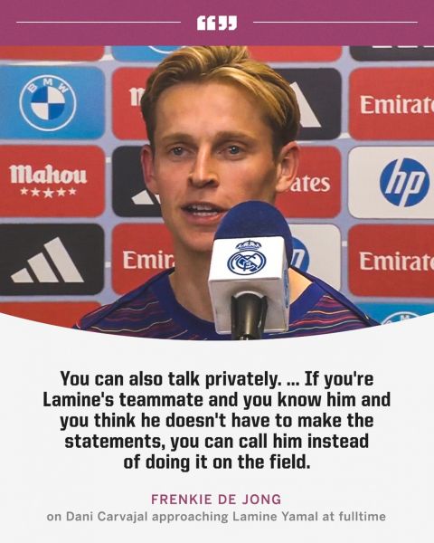 Μία από αυτές ήταν το λεκτικό επεισόδιο που είχε ο Λαμίν Γιαμάλ με τον Ντάνι Καρβαχάλ. Κάτι που δεν άρεσε σε πολλούς παίκτες των φιλοξενούμενων. Γι’ αυτό τον λόγο με δηλώσεις του ο Φρένκι Ντε Γιονγκ ήθελε να σταθεί εκεί και να επισημάνει ότι ο Ισπανός μπακ -και ένας από τους θρυλικούς αρχηγούς της Ρεάλ Μαδρίτης- θα μπορούσε να αντιδράσει με μεγαλύτερη ψυχραιμία και με την εμπειρία που έχει να κάνει τα σχόλιά του προς τον Ισπανό εξτρέμ όταν θα ήταν μόνοι τους ή όταν δεν θα ήταν πάνω τους όλες οι κάμερες.